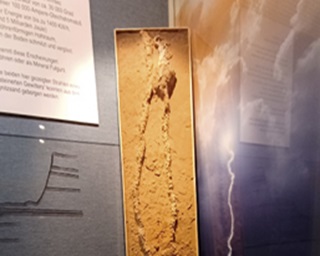 Als Überraschung wurde hier allerdings ein Befund gesichert, der ungewöhnlicher nicht hätte sein können: eine senkrecht nach unten führende schmale Quarzspur. Auf die Anweisung des Grabungsleiters, sofort zu stoppen, hier steckt ein Blitz, folgte zunächst völliges Unverständnis bei den Mitarbeitern. Aber nach weiterem Freilegen war im Sand zum allergrößten Erstaunen die Spur eines Blitzeinschlags zu erkennen, zwei etwa fingerdicke Energiestrahlen, sogenannte Blitzröhren, der Fachmann nennt sie Fulgurit, die dann bis zu einem Meter Tiefe geborgen werden konnten. Eine elektrische Funkenentladung bei Gewitter kann sich sowohl als Wolken-Wolken als auch als Wolken-Erde-Blitz entwickeln. Bei einer Geschwindigkeit von 300 km/sec, einem Energiestoß von bis zu 1400 KW/h und einer Temperatur von ca. 30.000 Grad entsteht ein röhrenförmiger Hohlraum im darum geschmolzenen Boden, hier im Sand.