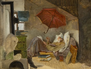 Lüsterne Blicke und schmachtendes Hinterherblicken, einsame Begegnungen im Wald, Verführungen in freier Natur, nächtliche Ständchen und Stelldicheins: Carl Spitzweg (1808-1885) stand mitten im Leben und entlarvte mit seinen Anspielungen auf die Liebe und das Eheleben nicht selten die Doppelmoral, die sich hinter der Maske von Bürgerlichkeit und Sittsamkeit verbirgt. Blickt man auf sein Oeuvre, dessen größter Bestand im Schweinfurter Georg Schäfer Museum liegt, fällt der Blick auf den roten Schirm, den Spitzweg in der Zeit von 1835 bis 1880 immer wieder wie ein Requisit in seine Bilder hineinmalte.